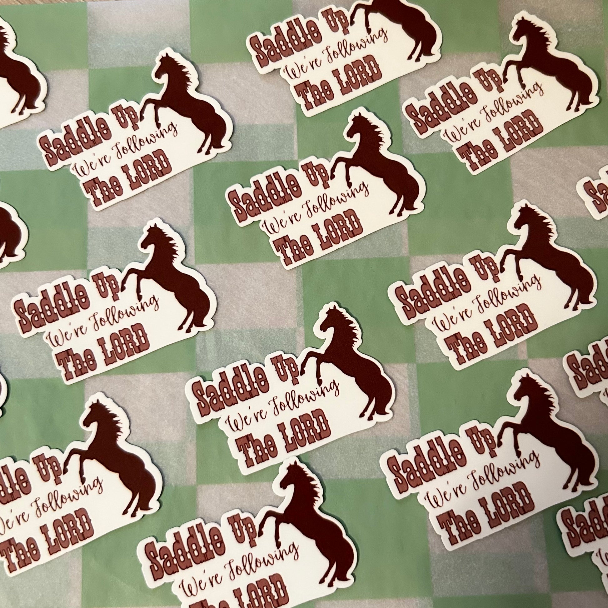 This 1 x 2” decorative sticker features a beautiful brown horse, paired with the bold, faith-filled phrase, “Saddle Up We’re Following The Lord.” With a rustic, western charm, this design inspires courage, obedience, and adventure in faith. Perfect for Bible covers, water bottles, planners, or gifts. It is a fun and stylish reminder to ride boldly with God leading the way!
